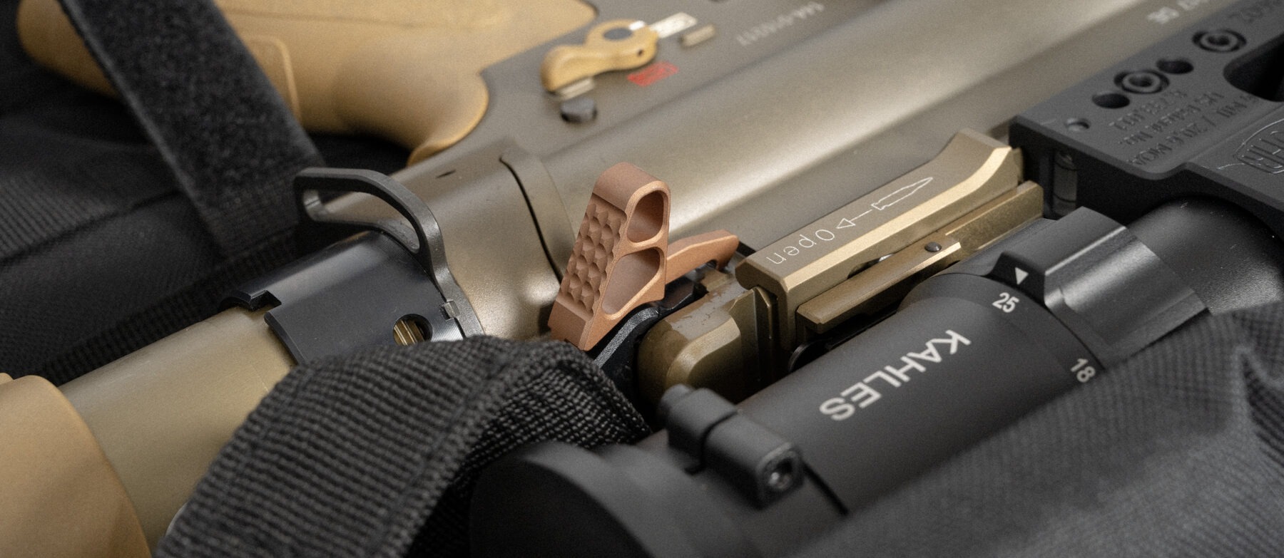 Die griffigen, präzise gefertigten Bedienelemente – optional farblich abgesetzt – aus eloxiertem Aluminium erleichtern das durchladen ohne dabei das gesamte Handling der Waffe zu stören. Durch die skelettierte Bauweise sind die Teile sowohl leicht als auch robust.